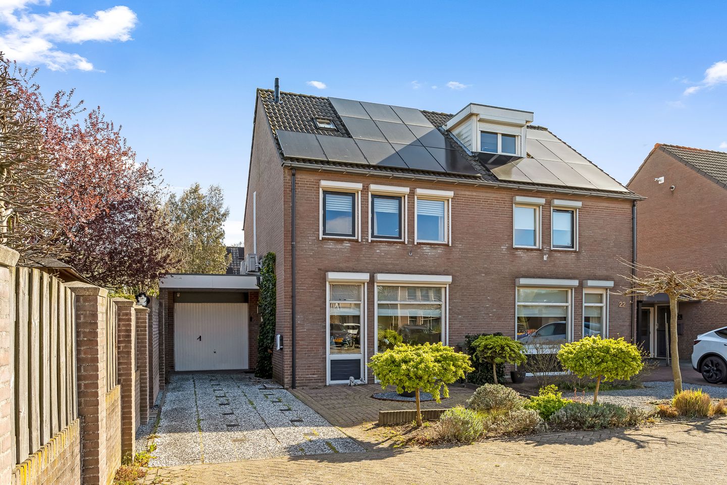 De woning is voorzien van een voor- en achtertuin. Aan de voorzijde een oprit naar de garage waarop plaats voor meerdere auto's. Ook is hier een aansluitpunt voor het opladen van een elektrische auto.