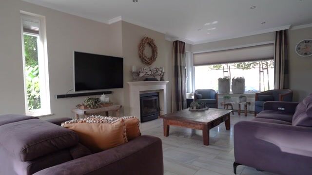 De riante L-vormige woonkamer is voorzien van een sfeervolle haardpartij met houtkachel. De afwerking bestaat uit een natuurstenen vloer, stucwanden en een stucplafond. Vanuit de woonkamer valt er van een vrij uitzicht over de achtertuin te genieten en is er middels dubbele schuifdeuren toegang tot de keuken.