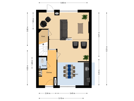 - 36 m² (7,82 meter diep en 5,69 meter breed)
