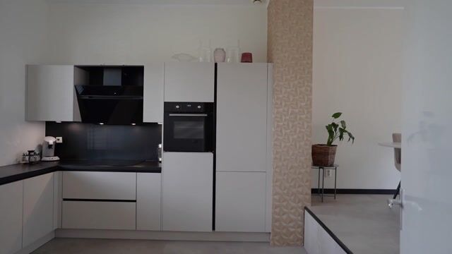 De keuken ligt iets lager, wat zorgt voor een speels effect, en biedt een fijn uitzicht over de straat. De keuken is strak ingericht in een rechte opstelling en voorzien van alle gemakken: koelkast, vriezer, inductiekookplaat met afzuigkap, oven en vaatwasser. Het geheel is afgewerkt met een kunststof werkblad en sluit naadloos aan op de stijl van de woonkamer.