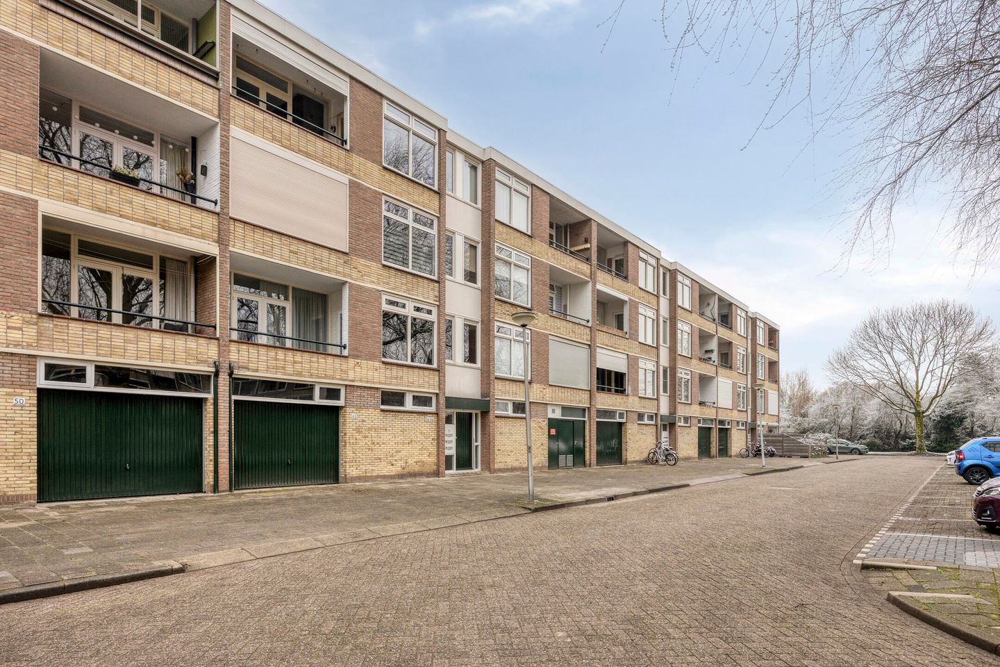 Afgesloten entree met brievenbussen en toegang tot de portieken via het trappenhuis.