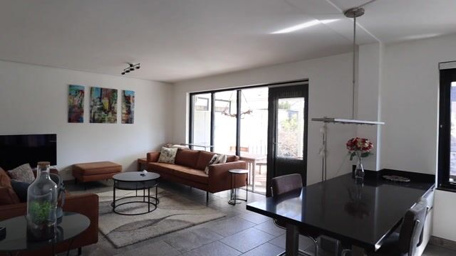 De begane grond is overzichtelijk ingedeeld en opgebouwd uit duidelijke leefruimtes. De woonkamer is vergroot met een extern aangebouwde overkapping, wat zorgt voor extra gebruiksruimte en flexibiliteit in de indeling. Deze overkapping is deels afsluitbaar met harmonica wanden, waardoor je eenvoudig schakelt tussen een open geheel en een meer afgesloten ruimte. Het plafond met kantelbare lamellen maakt het mogelijk om licht en schaduw naar wens te reguleren. Hierdoor pas je de ruimte moeiteloos aan op het moment van de dag en het seizoen.