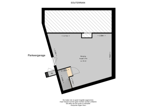 Het souterrain van circa 34 m² biedt volop bergruimte en directe toegang tot de parkeergarage. De meterkast bevindt zich eveneens in de garage. De parkeergarage is afgesloten en voorzien van een op afstand bedienbare deur.