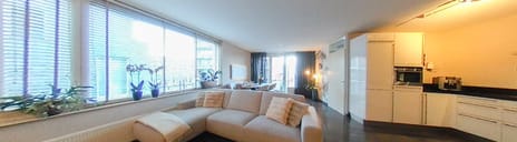 De ruime woonkamer heeft een prachtige lichtinval dankzij de grote ramen en openslaande deuren naar het balkon aan de achterzijde. Hier geniet je van een weids uitzicht over de vijver, dat zorgt voor rust en ruimte in het dagelijks leven. De natuurstenen vloer met vloerverwarming geeft het geheel een luxe uitstraling en maakt de woonkamer tot een aangename plek om te verblijven.