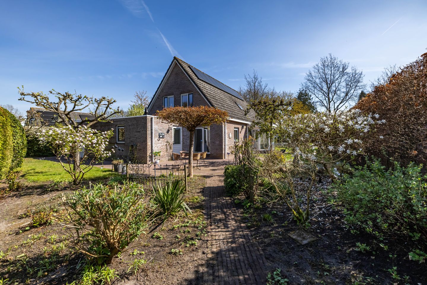 Rondom de woning ligt een royale en verzorgde tuin met gazon, borders en meerdere terrasmogelijkheden, waardoor er altijd een plek in de zon of schaduw te vinden is.