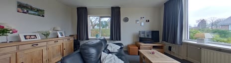 De woonkamer is licht en sfeervol, met een speelse L-vorm die gezelligheid combineert met ruimte. Grote ramen bieden een fraai uitzicht op de voortuin en laten veel daglicht binnen.