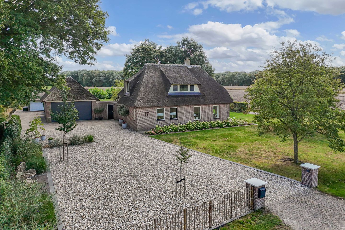 Buiten komt het landelijke karakter volledig tot zijn recht. De fraai aangelegde tuin biedt volop privacy en meerdere terrassen waar je op elk moment van de dag van zon of schaduw kunt genieten. De vrijstaande riet gedekte schuur/garage met royale overkapping vormt een heerlijke plek om te ontspannen en te genieten van het uitzicht over de weilanden, de natuur en de ondergaande zon!
