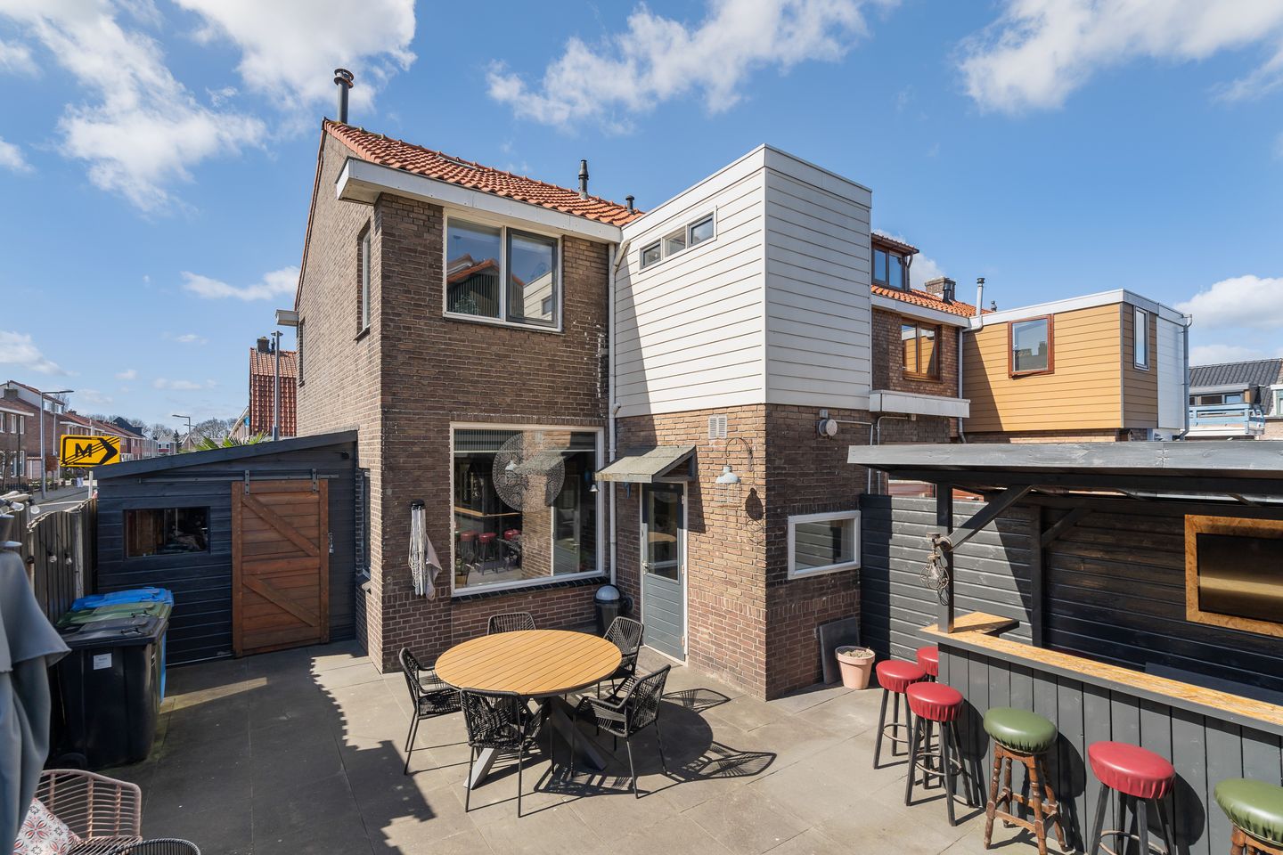 Houten berging in de zij tuin, en een sfeervolle buitenbar in de achtertuin.