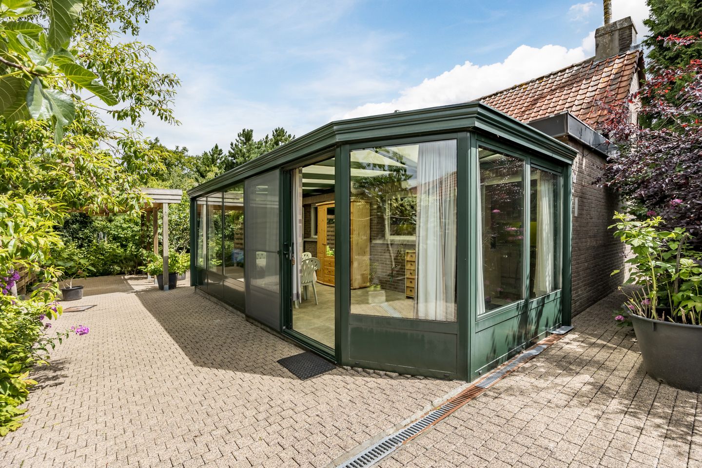 De serre is bijzonder ruim en is voorzien van een tegelvloer, 2 schuifpuien en biedt altijd contact met de heerlijke tuin.