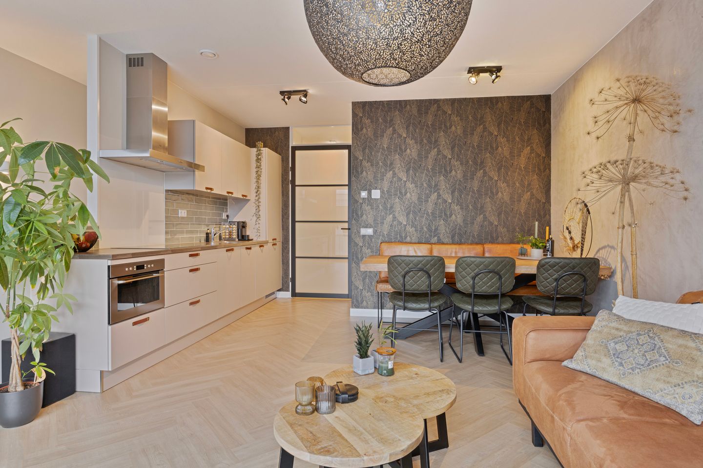 What is immediately noticeable are the large windows that provide extra daylight in the living room, combined with a beautiful finish. The house was completely renovated in 2021. The living room has a beautiful appearance due to the modern plasterwork on the walls, a designer wall radiator and an open kitchen. Through the sliding doors you reach the spacious south-facing balcony, which offers enough space to enjoy the sun all day long. A large electric awning has been placed above the balcony, ideal for creating shade on sunny days.