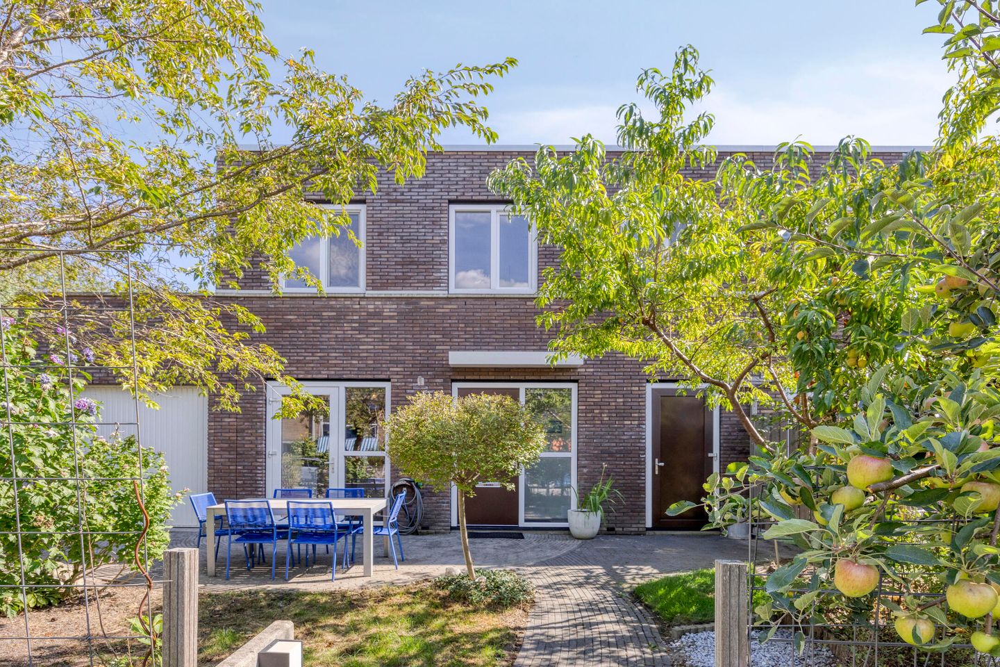 De achtertuin is een plek om verliefd op te worden: zonnig gelegen op het zuidoosten, met uitzicht op een groenstrook met volwassen bomen - een zeldzaam rustige plek. De tuin is ingericht met een betegeld terras, een pergola begroeid met druivenranken, én een zijtuin vol moerbeien, frambozen en pruimen. Ook de voortuin is een bloeiende oase met een fijne zithoek en veel privacy.