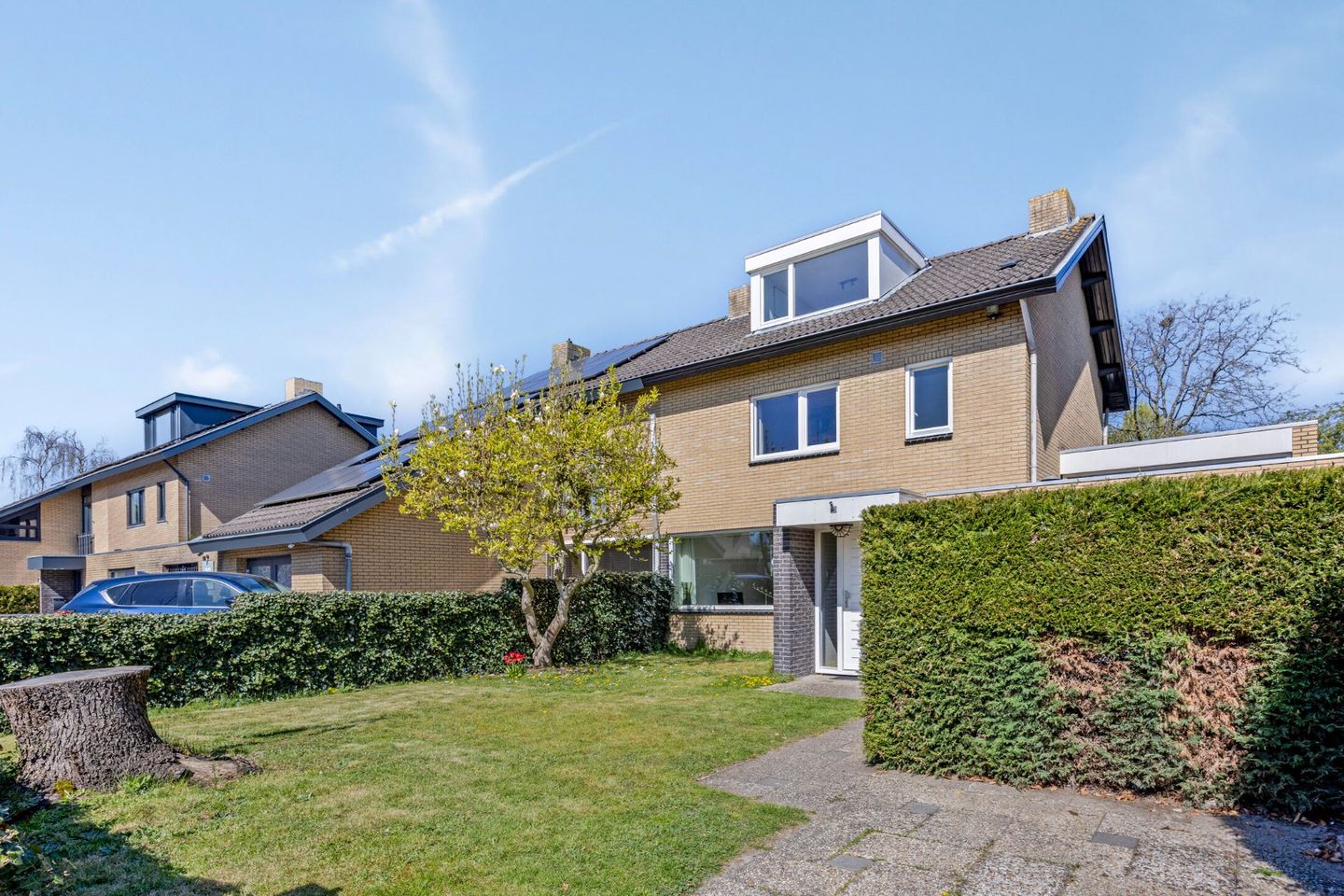 Ruime, diepe voortuin gelegen op het zuiden met volop ruimte voor kinderen en een terras. Bovendien een ruime oprit met laadpaal.