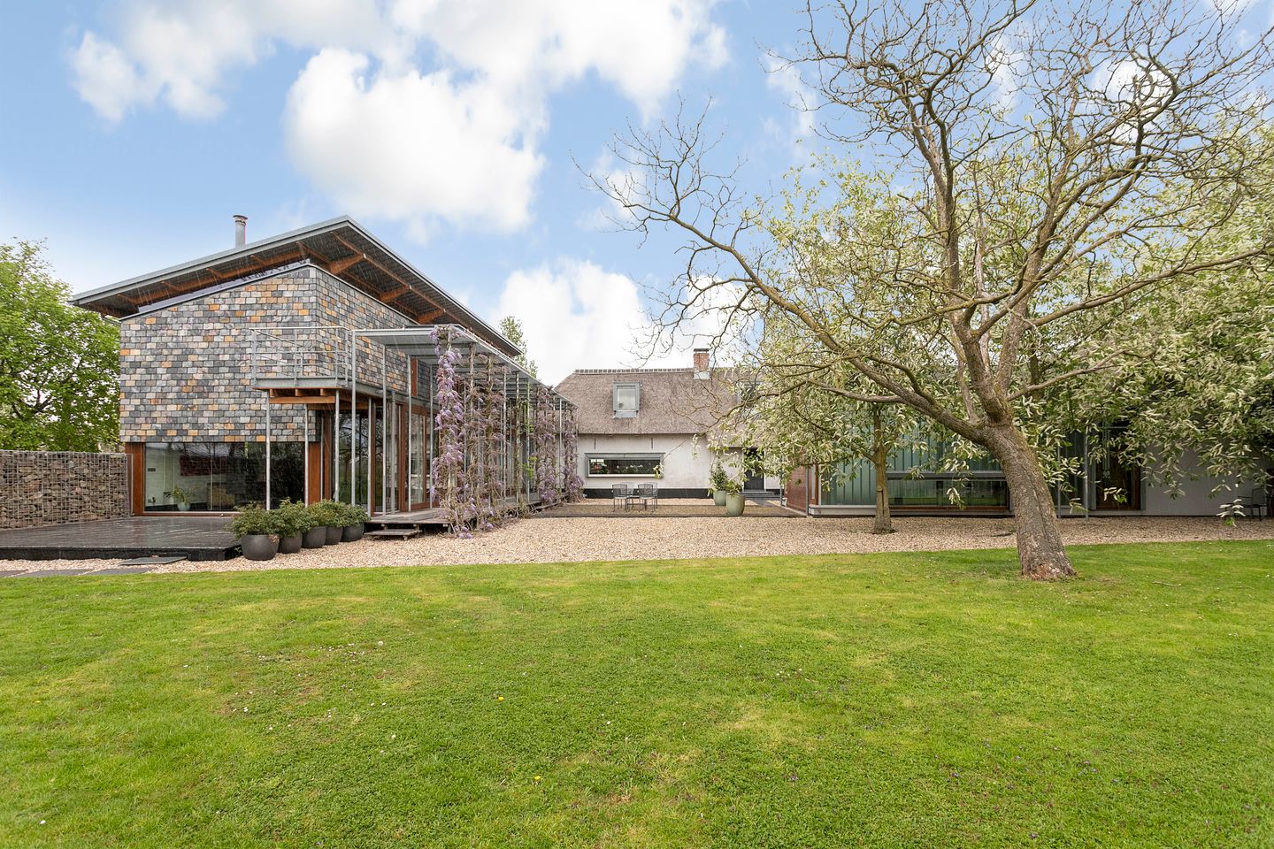 Dit markante ‘thuis” biedt vele mogelijkheden, heeft multifunctionele ruimtes voor werk/kantoor aan huis of praktijkruimte, atelier. Vanwege de meerdere badkamers en keukens is dubbele bewoning direct mogelijk. Het huis heeft energielabel A++, is verduurzaamd met warmtepompen en zonnepanelen en is nu energie neutraal. Het is in 2002 onder architectuur uitgebreid met een linker en rechtervleugel. Het oudste deel van dit unieke object dateert uit 1900. De architect, oTTo van Dijk, heeft de oude boerderij en de nieuwe woongedeelten zowel van buiten als van binnen op harmonieuze wijze weten te verbinden. De gebruikte duurzame materialen zijn onder andere: riet, Afrikaanse leisteen, zink, stukwerk, Siberisch lariks, profielglas enz.. Hiermee zijn vele mooie verfijnde detailleringen gecreëerd. De oude boerderij is op de originele gevels na geheel vernieuwd en gemoderniseerd. De beleving van het open polderlandschap is goed zichtbaar vanuit de leefruimtes. Er zijn veel terrassen/plekken om aangenaam in/uit de zon en uit/in de wind te vertoeven. Een landschapsarchitect heeft middels grote vakken met zomer/veldbloemen vorm gegeven aan de wei.
