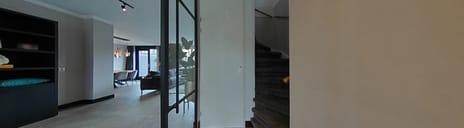 Je komt binnen in de hal met toilet en trapopgang. De ruime woonkamer strekt zich uit over de gehele breedte van de woning en is dankzij de grote ramen heerlijk licht. De stalen deuren zorgen voor een moderne uitstraling en vormen een mooi contrast met de lichte wanden en tegelvloer. De moderne open keuken bevindt zich aan de voorzijde en is uitgerust met moderne inbouwapparatuur en volop bergruimte, ideaal voor de kookliefhebber. Via de tuindeur stap je zo de tuin in, waar het zomer en winter goed vertoeven is.
