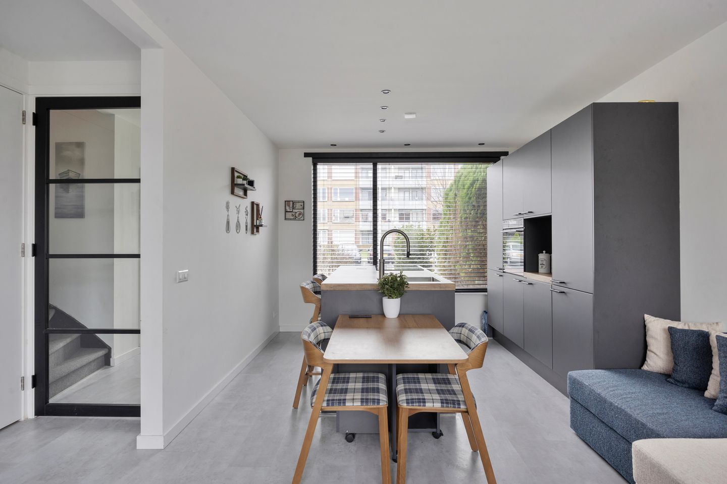 The ground floor features a modern and luxurious kitchen with a cooking island, Quooker, dishwasher, combi oven/microwave, and a low-maintenance composite worktop. This floor also includes a sleekly finished toilet, a practical under-stairs storage cupboard, and a renewed meter cupboard (2022). The entire floor has been stylishly modernized and finished.