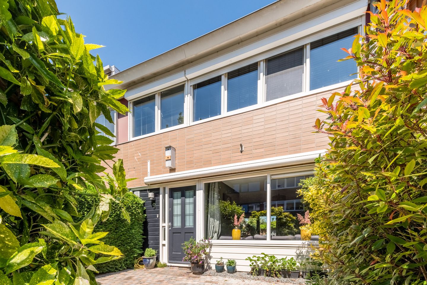 • Omhaagde voortuin en beschutte achtertuin met overkapping