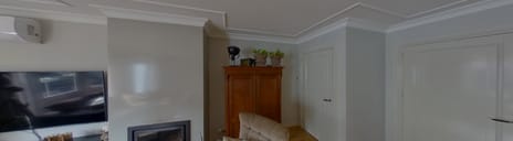 Ook hier hebben de plafonds sierlijsten en inbouwspots. De frisse, keurige badkamer is ingedeeld met een ligbad met douchevoorziening, modern wastafelmeubel en wandkast met praktische opbergruimte voor bijvoorbeeld de handdoeken.