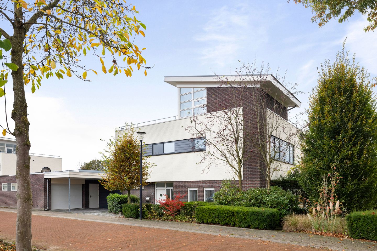 Let op de details zoals het "metalen dak", de grote raamvensters met ook een rond raam en de kleuraccenten van de gevels en kozijnen. De leefruimte met de woonkeuken op de begane grond en de vier ruime kamers bieden je alle ruimte om heerlijk te wonen en te leven.
