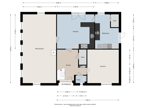 Middels overdekt entree betreedt men de hal met voorraadkast en toilet. De hal geeft toegang tot o.a. kantoor- en/of slaapvertrek en de woonkeuken. Via de woonkeuken verkrijgt u toegang tot de ruim bemeten woonkamer alsmede de bijkeuken met o.a. wasmachine-aansluitingen en voorraadkast.