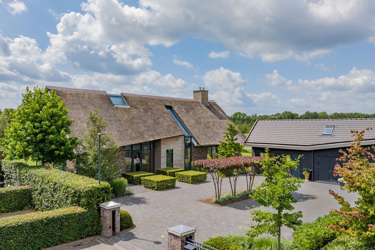 Binnen leven en buiten wonen smelten volledig samen in deze moderne, onder architectuur gebouwde villa uit 2016. De speelse vorm van het rieten dak sluit naadloos aan op de grote raampartijen en de fraaie combinatie van stenen en hout in de gevels. De bijzondere bouw van dit huis op het zuiden zorgt ook voor een unieke, fijne lichtinval in elk vertrek. De villa biedt veel privacy en een prachtig uitzicht over de royale tuin met waterpartijen en het naast gelegen landgoed. Zo beleeft u comfortabel en geborgen het natuurlijke schouwspel van alle seizoenen. Aan het eind van de dag is het genieten van de zonsondergang op het terras met overstek, grenzend aan de living. Het warme, intieme woongenot komt ook tot uiting in alle gemakken waarvan deze woning is voorzien. De warmtepomp, vloerverwarming en koeling, warmte-terugwin-systeem en 76 zonnepanelen zorgen voor gerieflijkheid en een energielabel A++++, wat extreem lage energiekosten met zich meebrengt. De vloerverwarming-/koeling van de hardstenen vloer zorgt voor een aangename temperatuur. Het is mogelijk, indien gewenst, de vloer te voorzien van een hout-look, de verkoper heeft hier reeds een offerte voor en is bereid u hierin tegemoet te komen.