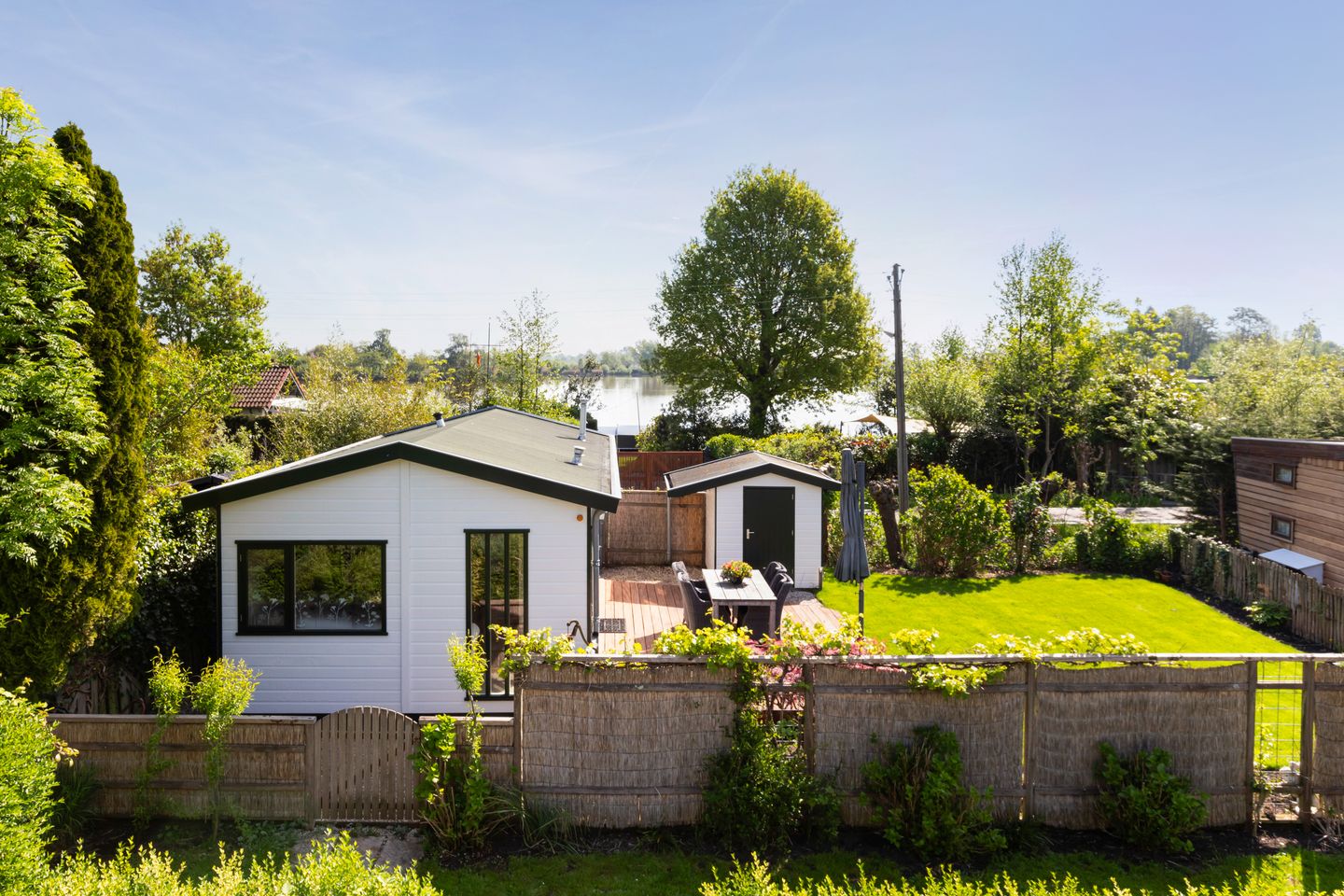 Rondom het chalet ligt een fraai aangelegde en goed onderhouden tuin, waar je de hele dag van de zon kunt genieten. Aan de zuidzijde bevindt zich een onderheid vlonderterras met een vaste zandbak. Er is een keurig grasveld en een vrijstaande houten berging, voorzien van elektra, water en een aansluiting voor wasapparatuur. Ook is er een buitenaansluiting voor water aanwezig – handig voor tuinonderhoud of het afspoelen van spullen na een dag op of rond het water.