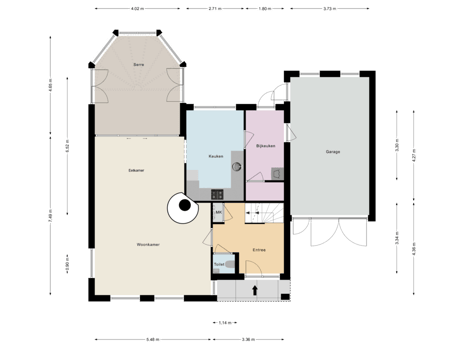 Garage met tegelvloer, dubbele deuren en loopdeur naar straatzijde.