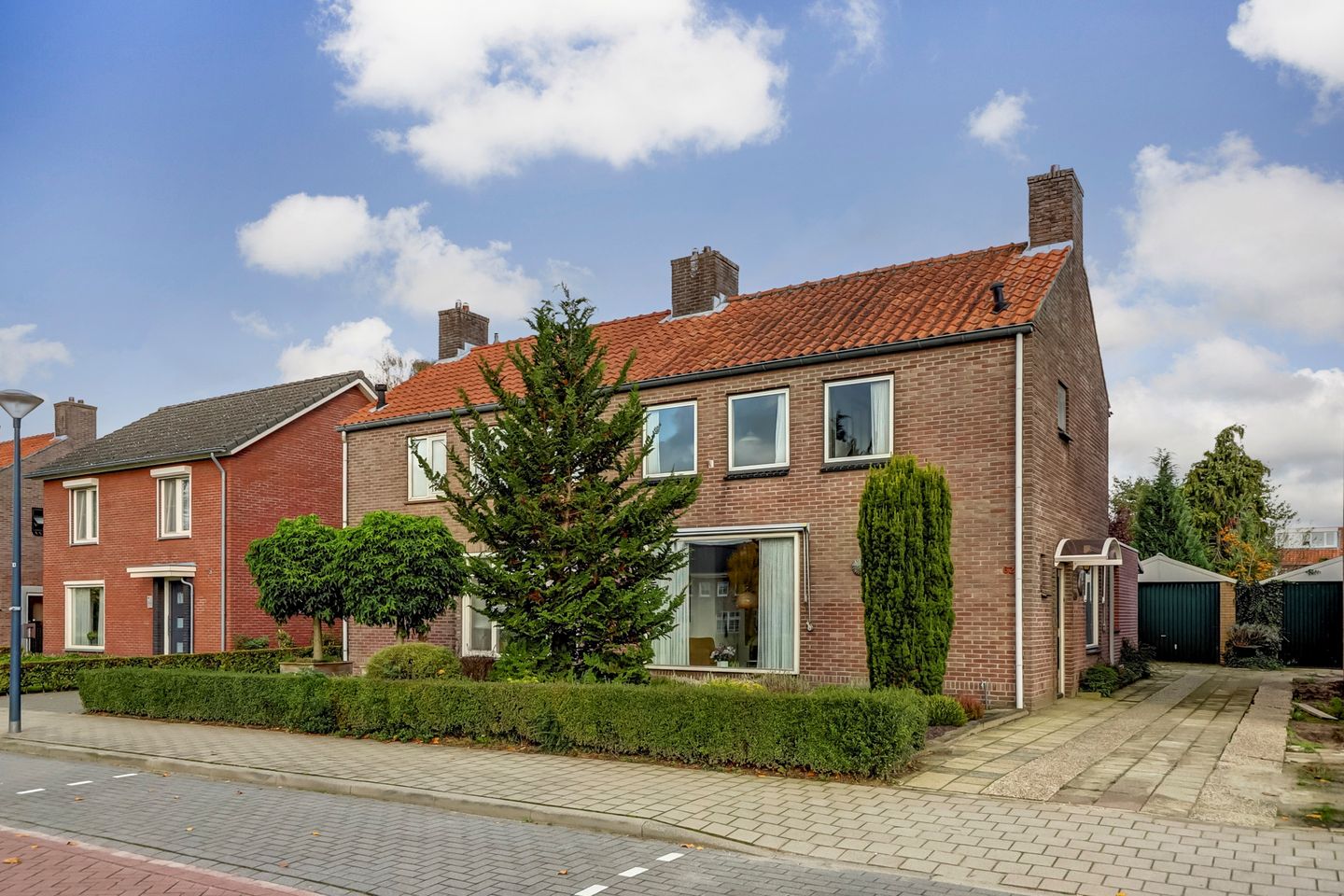 De voortuin is netjes aangelegd met voldoende groene planten. De grote boom biedt extra schaduw tijdens warme dagen. Aan de rechterzijde van de woning bevindt zich een oprit, die je toegang geeft tot de tuin via de schuifdeur aan de achterzijde.