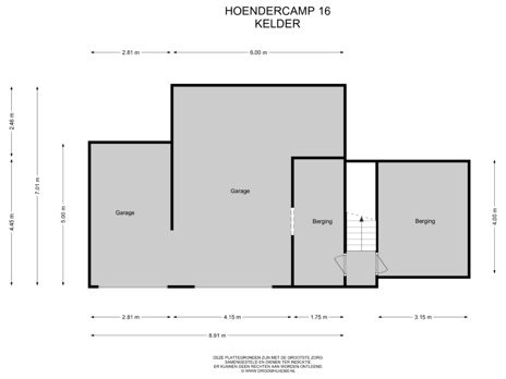 De wanden langs de trap naar de kelder zijn betegeld. De kelder is in meerdere ruimtes opgedeeld. Linksvoor is een berging (proviand ruimte) van ca. 3,15 x 4,00 mtr gelegen. Deze ruimte is voorzien van een tegelvloer. Onder het luik in deze ruimte staat de waterpomp opgesteld die het mogelijk maakt de tuin uit eigen waterbron te besproeien. Een tweede berging, ca. 1,75 x 4,00 mtr. leidt naar de eerste garage met een afmeting van ca. 4,15 x 6,91 mtr. met achter de berging nog een ruimte van ca. 1,75 x 2,46 mtr. Op dit moment is deze garage in gebruik als werkruimte. De garage is voorzien van een krachtstroomaansluiting en sectionaal garagedeur. In de oorspronkelijke “koekoek” onder de voordeur is een loopdeur naar de garage geplaatst. Rechtsvoor is in 2012 een tweede garage gerealiseerd van ca. 2,81 x 5,00 mtr. Deze garage beschikt eveneens over een sectionaal deur en is ook van binnenuit toegankelijk.