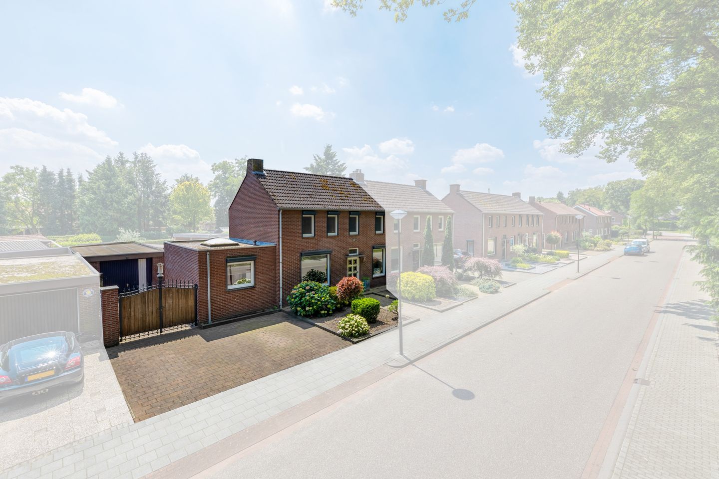 De voortuin is ook keurig aangelegd en biedt aan de linkerzijde toegang achtertuin middels de brede oprit met stalen af te sluiten toegangspoorten. In het midden van de aangelegde borders is een looppad naar de voordeur.