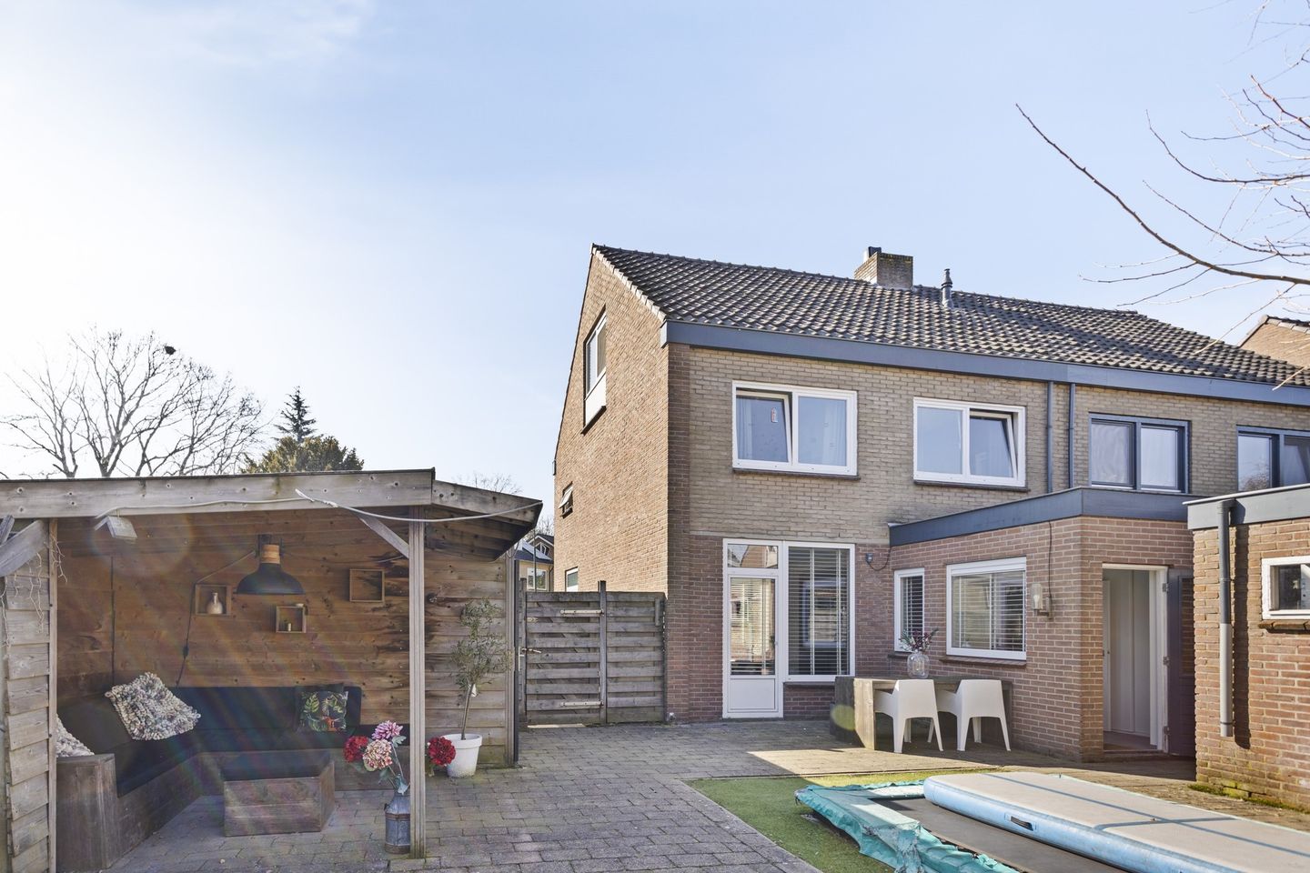 De tuin is een absoluut pluspunt van deze woning. Achter de woning ligt een royale, onderhoudsvriendelijke achtertuin op het zuidwesten met volop privacy. De tuin beschikt over een grote trampoline, een fijne overkapping met zithoek én een ruime berging. Dankzij de ligging op een hoek is het perceel extra breed en biedt het volop mogelijkheden voor zon, spel en ontspanning. De stenen garage is bereikbaar via de achterzijde en beschikt over een elektrisch bedienbare overheaddeur.