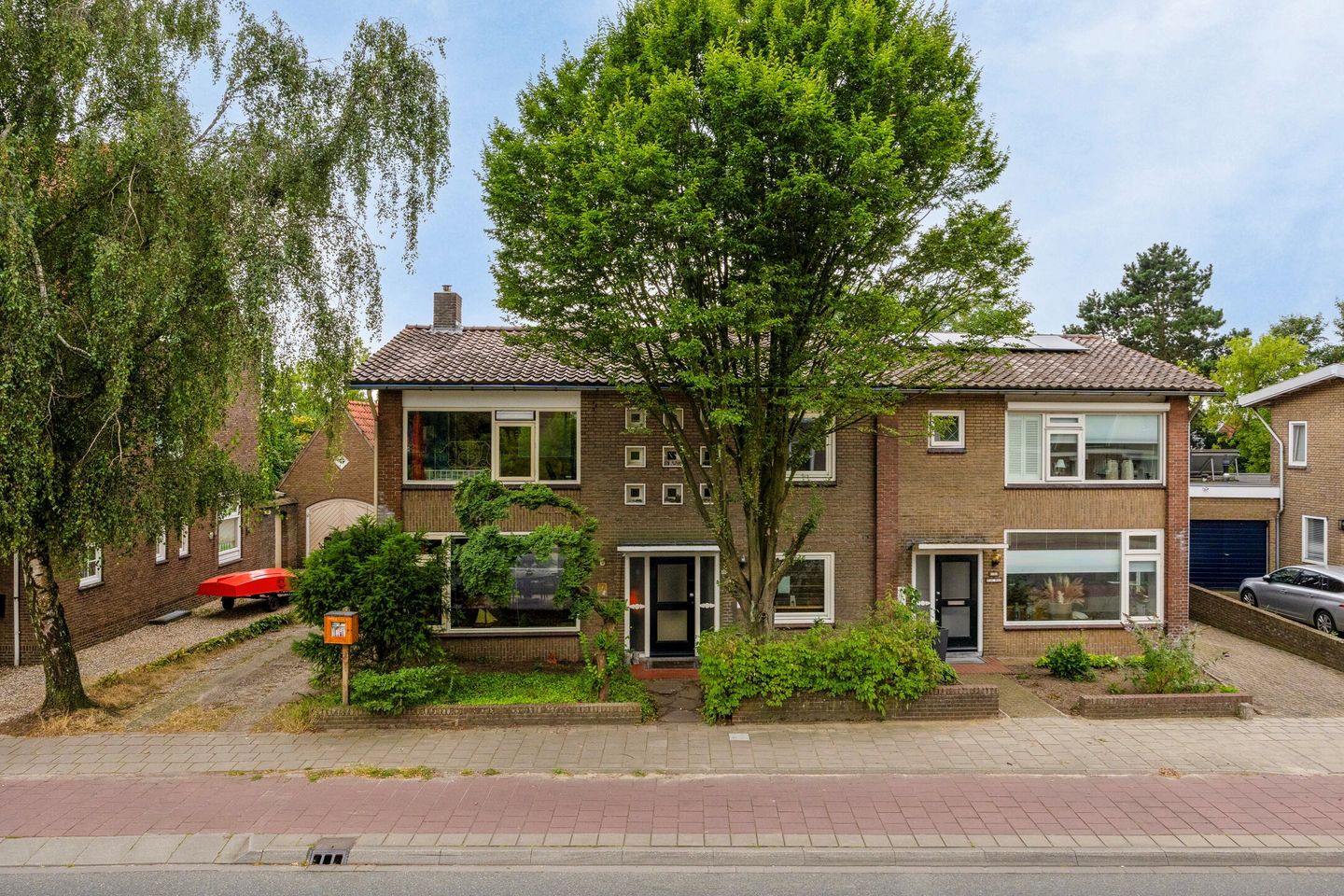 De voorzijde van de woning beschikt over een voortuin met een groen aanzicht en een oprit die ruime parkeergelegenheid biedt voor meerdere auto’s. De achterzijde is voorzien van een grote, 25 meter diepe tuin die groen is aangelegd en voor veel privacy zorgt dankzij volwassen beplanting en het ontbreken van achterburen. Het royale terras aan de woning is uitgerust met een zonnescherm en een gezellige zitkuil biedt extra ontspanningsruimte. De tuin biedt toegang tot alle bergingen, de vrijstaande garage en er is een handige achterom via de oprit.