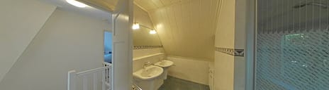 Daarnaast vind je hier een zeer royale, volledig betegelde badkamer met dubbele wastafel, spiegel, douche, ligbad en toilet.