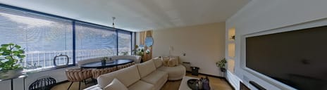 Aan de parkzijde bevindt zich de L-vormige living met moderne ombouw waarin verlichte nissen en een sfeerhaard zijn gecreëerd. De moderne open keuken is een ‘ware eyecatcher’. Het kookeiland is voorzien van een inductiekookplaat, geïntegreerde afzuiging en bargedeelte. De wandunit beschikt over uitgebreide inbouwapparatuur waaronder een koelkast, vriezer, magnetron-oven, Quooker en een vaatwasser. Via de keuken is er toegang tot het balkon welke is voorzien van 2 zonneschermen.
