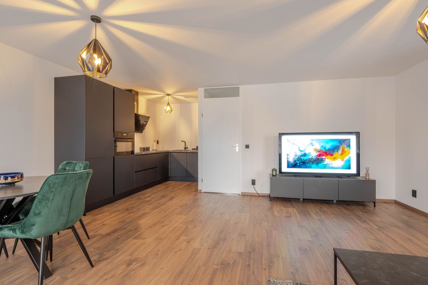 Bij binnenkomst in de hal is er direct toegang tot de 2 goede slaapkamers en kom je de bergruimte tegen met de witgoedaansluitingen. De moderne badkamer en het toilet zijn separaat en uitgerust in eenzelfde stijl. Aan het einde van de gang stap je de royale woonkamer met open keuken binnen. De strakke wanden en warme vloer geven het geheel een moderne uitstraling. De luxe inbouwkeuken is geheel in stijl in een matzwarte look en is voorzien van allerhande inbouwapparatuur. Via openslaande deuren in de woonkamer is er overigens toegang tot het ruime balkon met zicht op de omgeving.