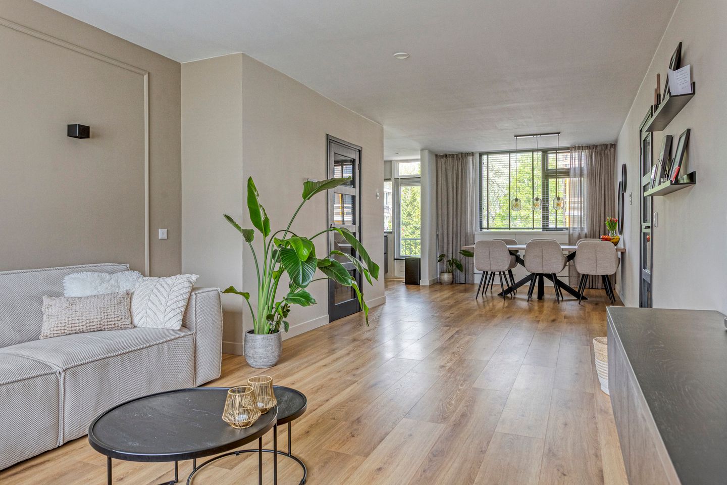 Zonnige & royale woonkamer van circa 3.78/3.15x10.63 met een grote ramen voor veel licht en zon. De woonkamer is vergroot door het doorbreken van de woonkamer en de 3e slaapkamer.