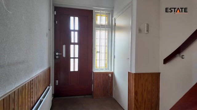 Entree met een ruime hal van circa 1.98x5.48 voorzien van garderoberuimte, de meterkast, trapopgang naar de 1e verdieping en de kelder en een deur naar de woonkamer. De betegelde toiletruimte met een hangend toilet en een fonteintje is uitgevoerd in het wit met grijs.
