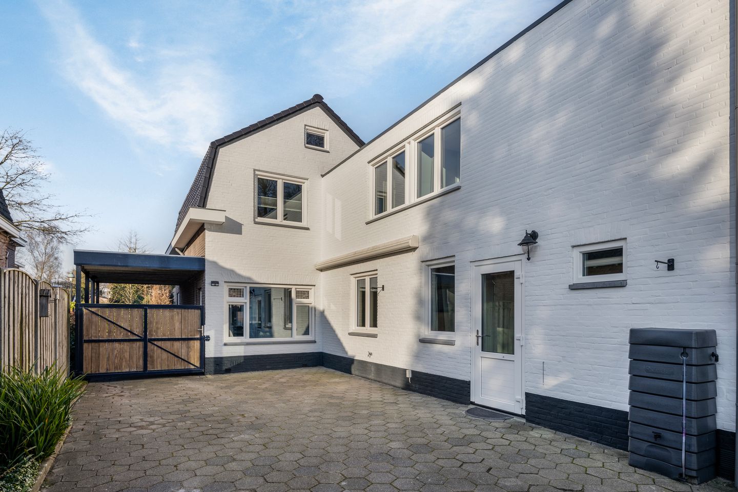 Als u achter in de tuin staat, ziet u hoe mooi de achterzijde van de woning (zonzijde) wit is geschilderd met een klassieke zwarte spatrand. Aan de rechterzijde van de woning is de carport met mooie stalen poort bekleed met houten planken.