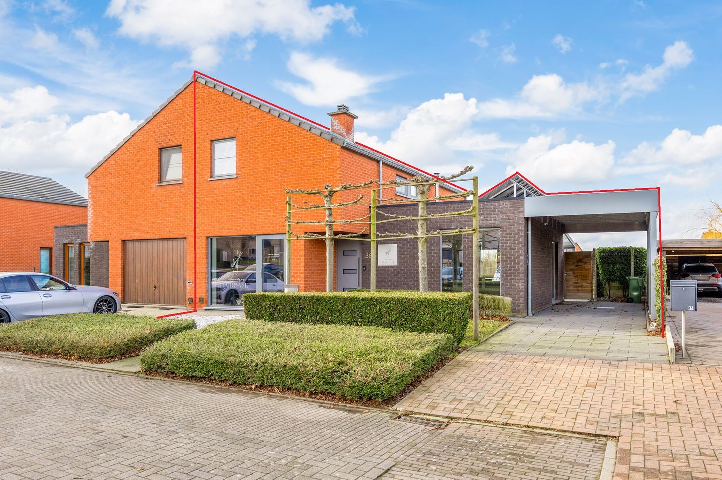 - De carport bevindt zich aan de rechterzijde van de woning, samen met de oprit biedt het plaats voor 3 auto's;