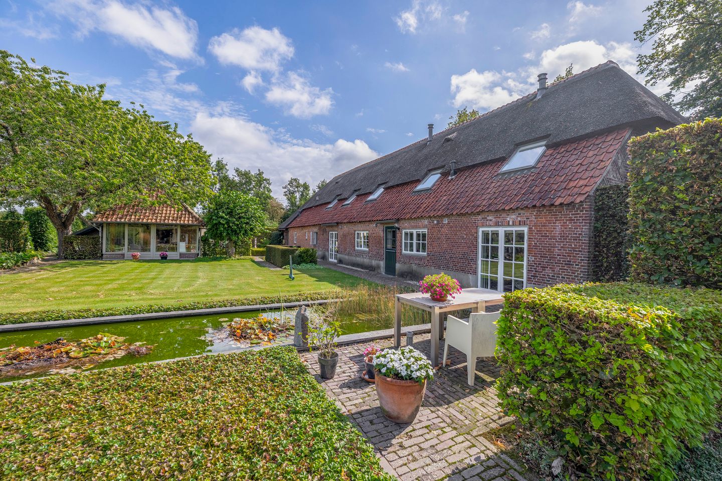 Achter de woning en aan de zijkanten ligt een prachtig aangelegde tuin. Aan de linkerzijde bevindt zich een mooi royaal stuk met gazon, plantenborders, bestrating van oude gebakken klinkers en diverse beukenhagen. Aan de achterzijde geniet je van een fraai zicht, een grote vijverpartij (met biologische filter), een ruim gazon, plantenborders en volwassen begroeiing. De tuin is goed aangelegd en goed onderhouden. Een dubbele oprit is aanwezig aan de rechterzijde van het pand. De tuin biedt zelfs de mogelijkheid voor het houden van kleine beestjes. Je vindt er ook een stukje tuin met een "de loverslane". Links van de woning ligt een aangelegde jeu-de-boules-baan.