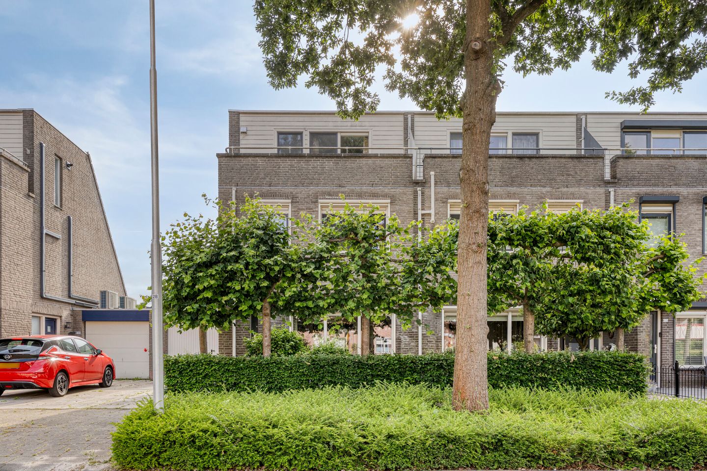 De royale over de volle breedte uitgebouwde hoekwoning (geschakeld) heeft een eigen parkeerplaats voor de multifunctionele aangebouwde garage, een voortuin en een diepe achtertuin. De voortuin zorgt voor extra privacy in de woning en maakt het straatbeeld beduidend fraaier.