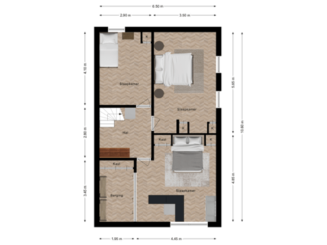De tweede slaapkamer, gelegen aan de achterzijde, is praktisch ingericht met een groot kunststof Velux dakraam, een laminaatvloer en extra bergruimte achter de knieschotten. De derde slaapkamer bevindt zich aan de zijkant van de woning, heeft een vinylvloer en een kopgevelraam, waardoor ook hier veel daglicht naar binnen valt.