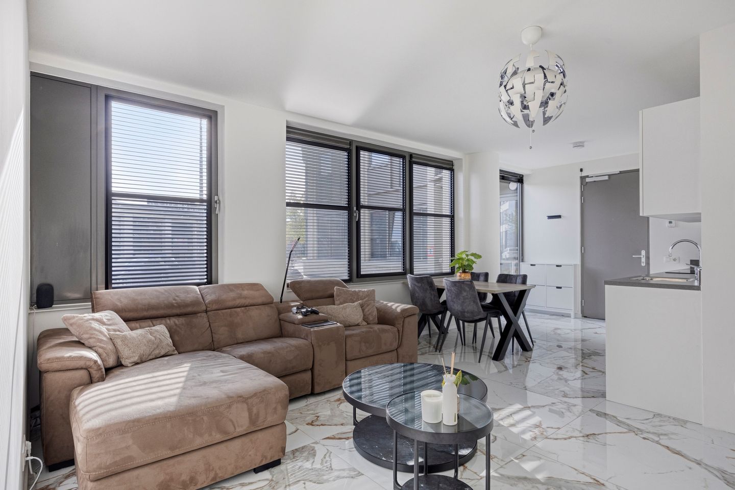 Via de hoofdingang bereik je vrijwel direct het appartement. Binnen kom je in een lichte woonkamer met open keuken, opvallend door de marmeren vloertegels en de overvloedige lichtinval. De keuken is strak en volledig uitgerust met moderne inbouwapparatuur: inductiekookplaat, combi-oven, koelkast, vaatwasser en afzuigkap. De woonkamer biedt ruimte om te ontspannen en nodigt uit tot gezellig samenkomen bij de eettafel.