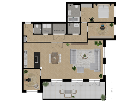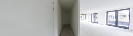 In the hall is the toilet, equipped with a neutral color tiling. Then in the hall is a closet with the connection for the washer and dryer and in the adjacent separate room the is the technical room. Through 2 French doors you walk into the more than spacious living room, equipped with an open kitchen. As long as the construction permits, it is still possible to choose your own color for this kitchen. The kitchen has a cooking island and everything is from Siematic.