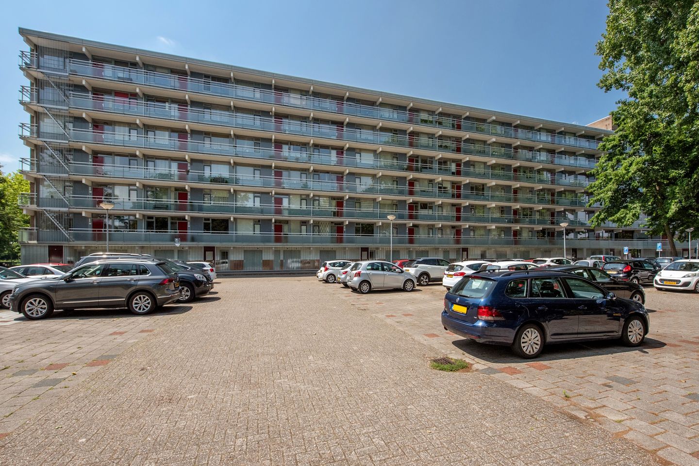 Afgesloten bellentableau met een ruime hal. Trap of lift door naar de 6e etage. Entree woning. Hal met garderoberuimte, meterkast, diverse opbergkasten en een keurig toilet voorzien van een duoblok met fontein en een granito vloer. Sfeervolle woon-/eetkamer voorzien van een radiatorombouw en een grote raampartij waardoor het aangenaam licht is in de woonkamer. Middels een deur toegang tot de achtergelegen zonnige balkon met houten vlonders en een weids uitzicht. Voorgelegen half open luxe keuken met royaal werkblad voorzien van diverse inbouwapparatuur w.o. een inductie kookplaat, oven, afzuigkap, groot formaat koelkast, groot formaat vriezer, vaatwasser en een rvs spoelbak met mengkraan. Voorgelegen ruime slaapkamer met radiatorombouw en een tv aansluiting. Vanaf de hoofdslaapkamer en of de hal toegang tot de moderne badkamer met originele granito vloer. Achtergelegen 2e slaapkamer volledig gestuukt met een deur naar de achtergelegen balkon. 3e (slaap/werk)kamer momenteel in gebruik als kastenkamer. Het appartement is voorzien van een keurige laminaat vloer.