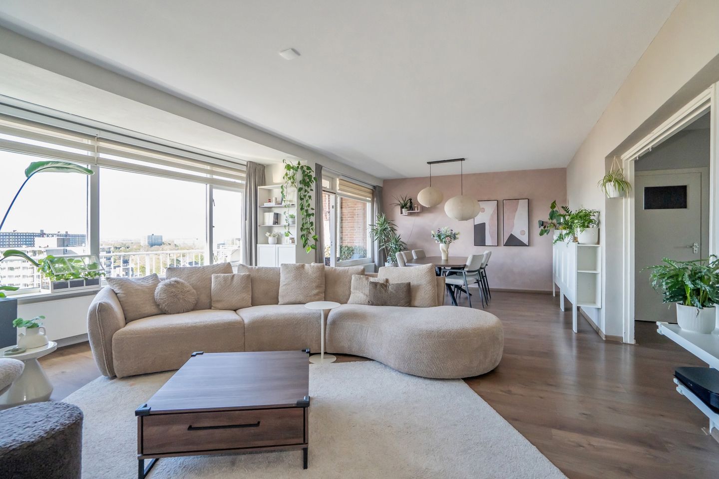 De woonkamer vormt zonder twijfel het hart van de woning. Wat direct opvalt is de enorme lichtinval dankzij de hoekligging en de grote raampartijen. De royale woon- en eetkamer biedt volop ruimte voor een gezellige zithoek en een grote eettafel. Vanuit hier stap je zo het zonnige balkon op het zuiden op, waar je in alle rust kunt genieten van het indrukwekkende uitzicht.