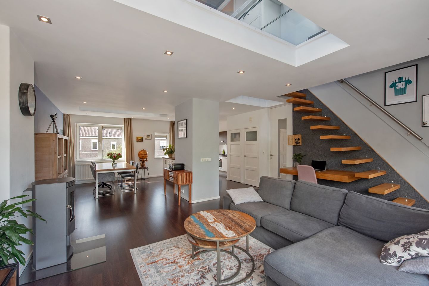 De kapverdieping is bereikbaar middels een stijlvolle moderne trap met houten ‘zwevende’ treden. Deze heerlijke open ruimte is geheel voorzien van een laminaatvloer, 7 dakramen en glazen vloerelementen waardoor bijzonder veel licht en een unieke beleving.