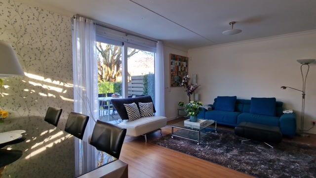 Vanuit de hal betreed je de lichte woonkamer met laminaatvloer, industriële glazen tussendeur en een trapkast met elektra. Dankzij de grote schuifpui heb je direct toegang tot de achtertuin aan het water. De convectorput zorgt voor een strakke afwerking, en via het beeldscherm in de woonkamer houd je zicht op de voordeur via de videocamera.