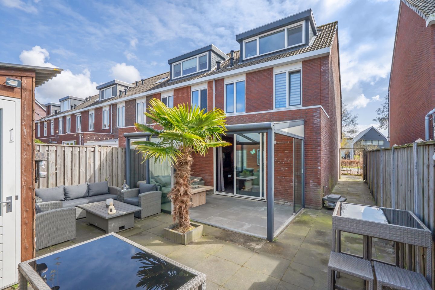 De tuingerichte woonkamer is heerlijk ruim en praktisch ingedeeld, met een handige trapkast voor extra bergruimte. Dankzij de grote schuifpui aan de achterzijde loopt binnen naadloos over in buiten. Hier bevindt zich een prachtige glazen serre uit 2019, die vrijwel volledig open te zetten is — een ideale plek om het hele jaar door te genieten van het buitenleven.
