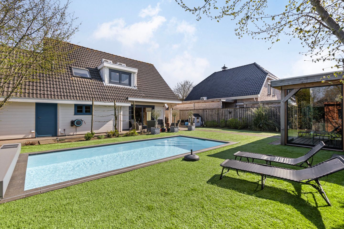 Chique aangelegde tuin, gesitueerd op het zonnige Westen, terras bestraat met sierbestrating, voorzien van zonnescherm, borders, buitenkraan, elektra, omheining rondom, dubbele poort naar voortuin, luxe zwembad (ca. 7B x 3,5L x 1,5H) als aangelegd in het jaar 2021 en verwarmd d.m.v. een luchtwarmtepomp, gefilterd d.m.v. een luxe pompinstallatie als volledig automatisch gereguleerd en afgedekt middels een elektrisch te bedienen beloopbaar doek;