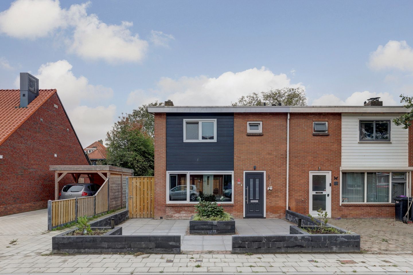 Voor de woning ligt een strak aangelegde voortuin met grijze tegels en verhoogde bloembakken: representatief en onderhoudsvriendelijk. De achtertuin is diep en lang, grotendeels bestraat met een siergazon. Dit biedt volop ruimte voor zowel een loungehoek als eettafel. Dankzij de zijpoort is de tuin makkelijk bereikbaar en oogt deze beschut door de houten schuttingen. De tuin naast de woning kan praktisch gebruikt worden voor het stallen van fietsen en/of het plaatsen van afvalcontainers.